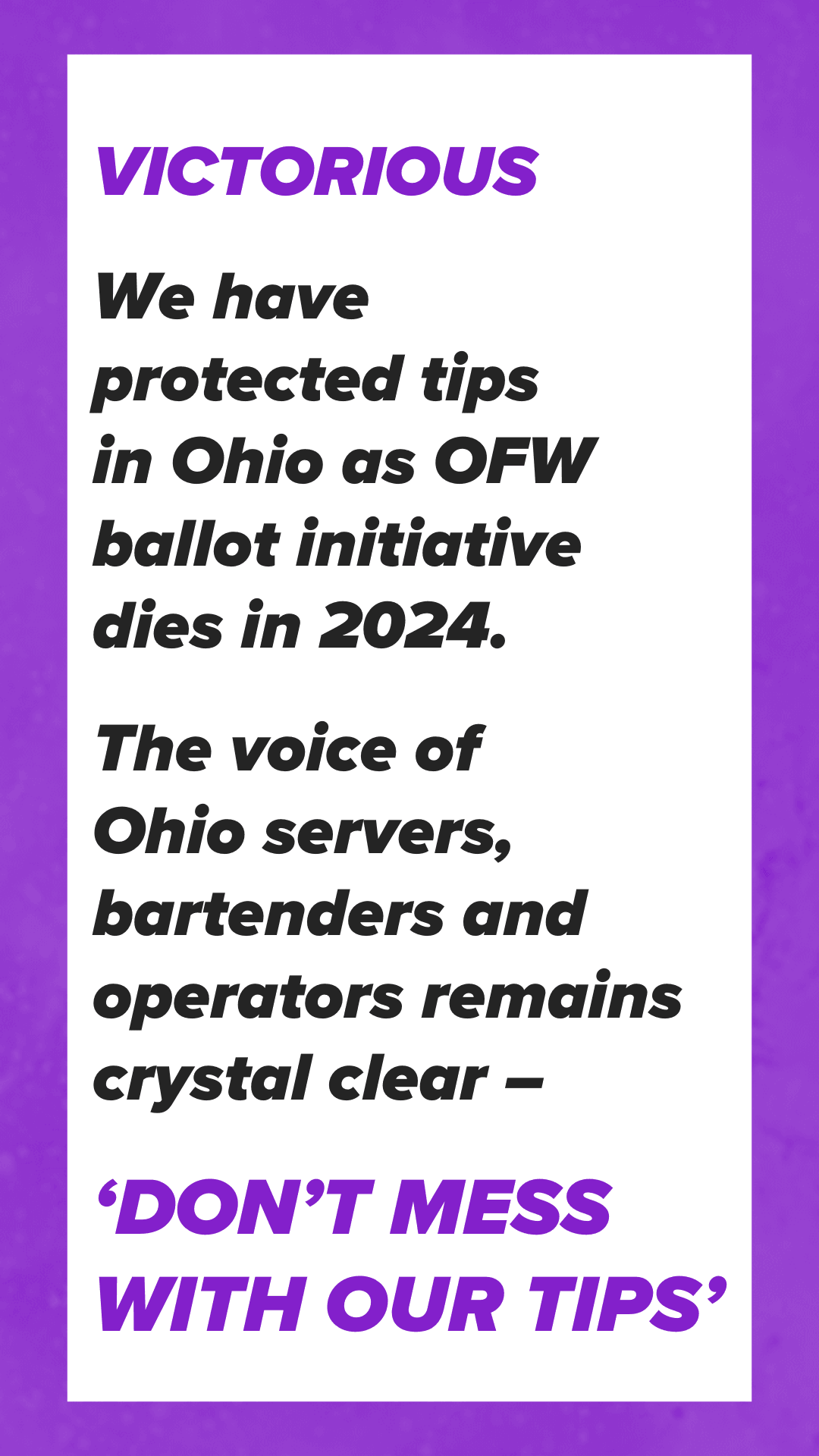 The Ohio Restaurant & Hospitality Alliance led a full-scale statewide education campaign to save the tipped wage by successfully raising awareness among servers, bartenders, operators, suppliers, elected officials and the public.